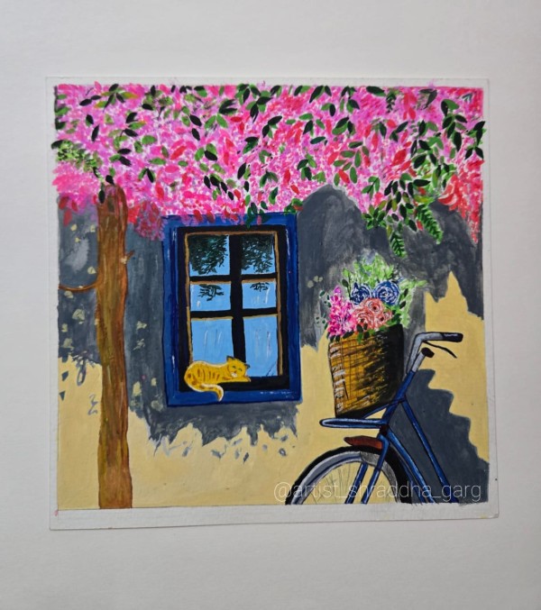 This painting captures a peaceful noon in a cozy corner. A cat sleeps softly, a bicycle rests nearby, and delicate floral patterns bloom on the wall, creating a serene and comforting atmosphere that invites calm and quiet reflection."