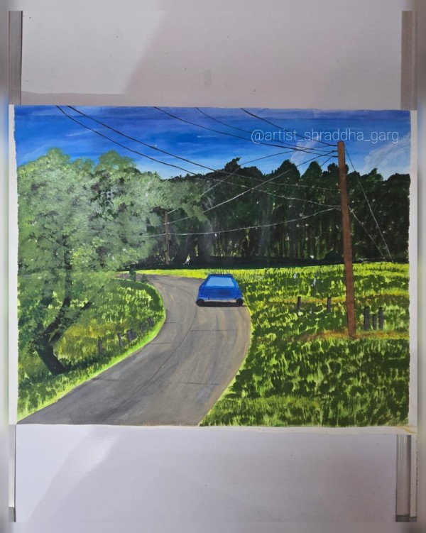 "This painting captures a serene moment on a highway, where a lone car moves past heavy, towering trees. The dense foliage creates a sense of calm and stillness, while the road hints at a journey, adventure, or passage of time. Itβs a quiet reflection on nature meeting human life, blending movement with tranquility."